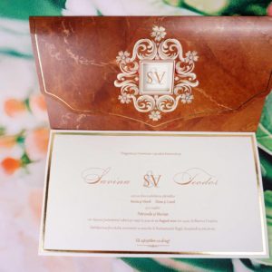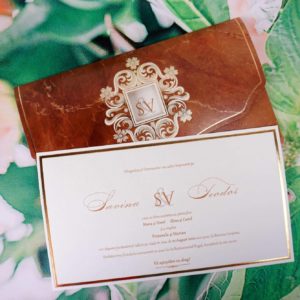 Invitatii de nunta confectionate dintr-un carton sidefat destinat textului. Acesta se introduce intr-o alta piesa tip buzunar cu model iesit in relief si un decupaj prin care se vede numele sau initialele mirilor. Invitatia nu contine plic clasic. Se personalizeaza cu textul pe care il doriti, corespunzator evenimentului dvs.