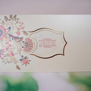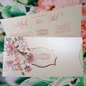 Invitatii de nunta confectionate dintr-un carton mat destinat textului cu un model vintage pe margini. Invitatia se introduce intr-un carton exterior care se inchide cu un snur care are un carton pentru trecerea numelor familiilor invitate la eveniment. Acest model nu contine plic clasic.
